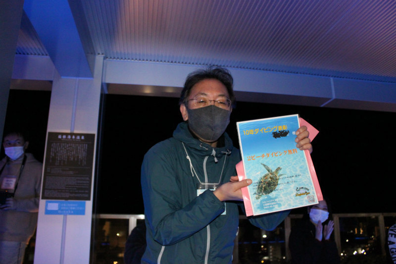 水中でスレートに「ポケットの中を探してみて」と書きました。実は前日から主役のBCのポケットにおめでとうフラッグを仕込んでおいたんです。この新しい方法は本当にサプライズになったようです。