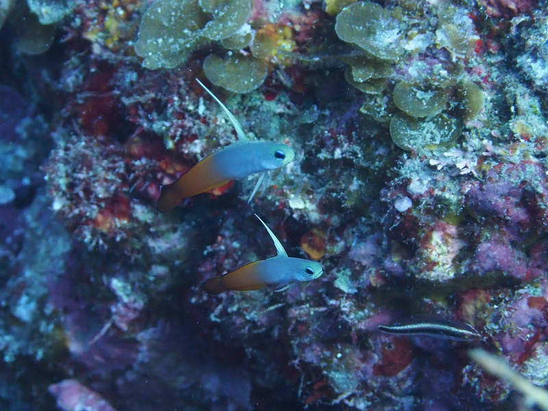 左の洞窟を出る頃には潜水時間も30分ほどに、ボートに帰る道すがらには水路があります。ダイバー1人分の幅の水路です。ボート下には上部が平たい大きな岩があって、じっくりマクロも楽しいです。この日はメガネスズメダイと言うオレンジ色の珍しいスズメダイを見れました。