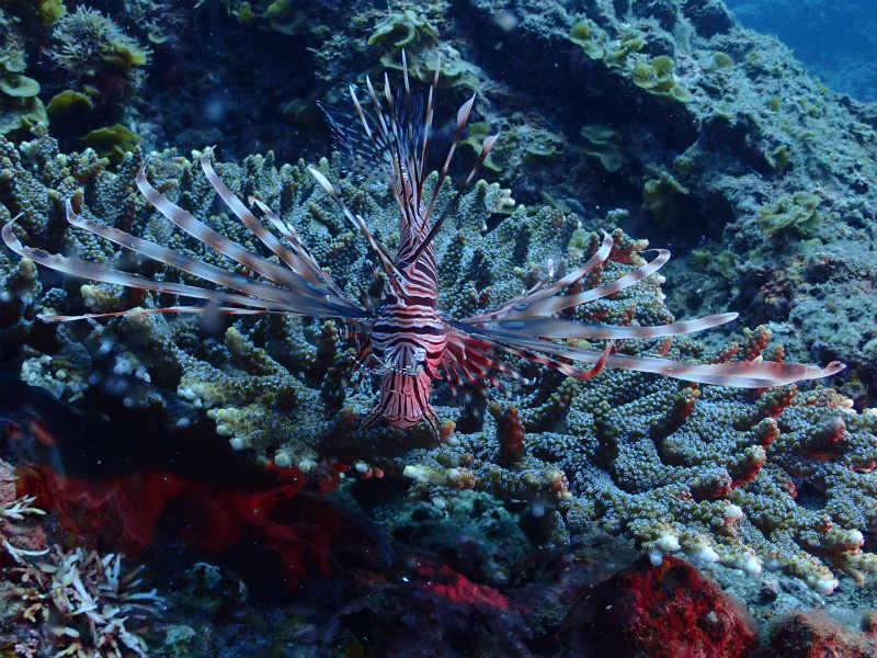 流れは緩やかで魚影バッチリ!断崖絶壁の根のまわりにキンギョハナダイがありえないほどいて、それを縫う様に大きなヘラヤガラがゆったり泳いでます。根頭だけでも十分楽しめますね。最後は根頭からフロートを上げ流されながらの安全停止、すぐにロープは見えなくなったので予定通りだったのですが、浮上たら潜降ブイからたった20mくらいのところに浮上してしまってビックリ、ほどんど流されてませんでした。水中では流れていたのに…こんなことってあるんですね。