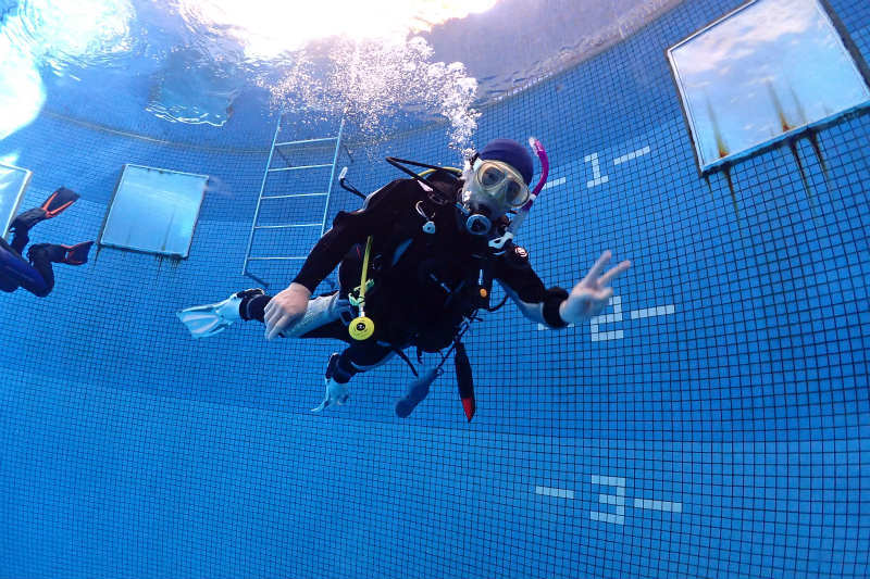 何もかもがほぼ初めてのプール実習、水中で初めてのレギュレータ呼吸、浮力調整練習をしました。