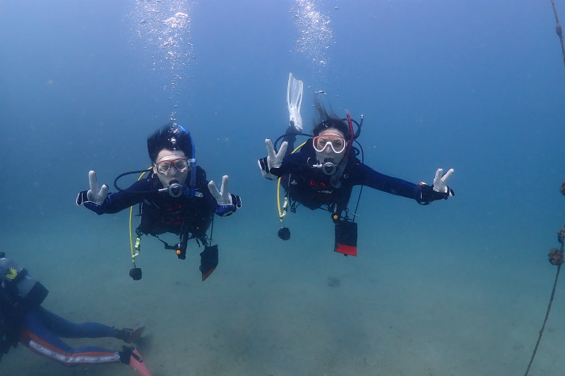 この4人はプール講習ではなく、海の浅い場所でプール実習の内容を行う「限定水域実習」を経験していますから、正確には「初めての海」ではありませんが、海洋実習からは水深が深くなっていきますよ。今回は10m程度まで経験できました。