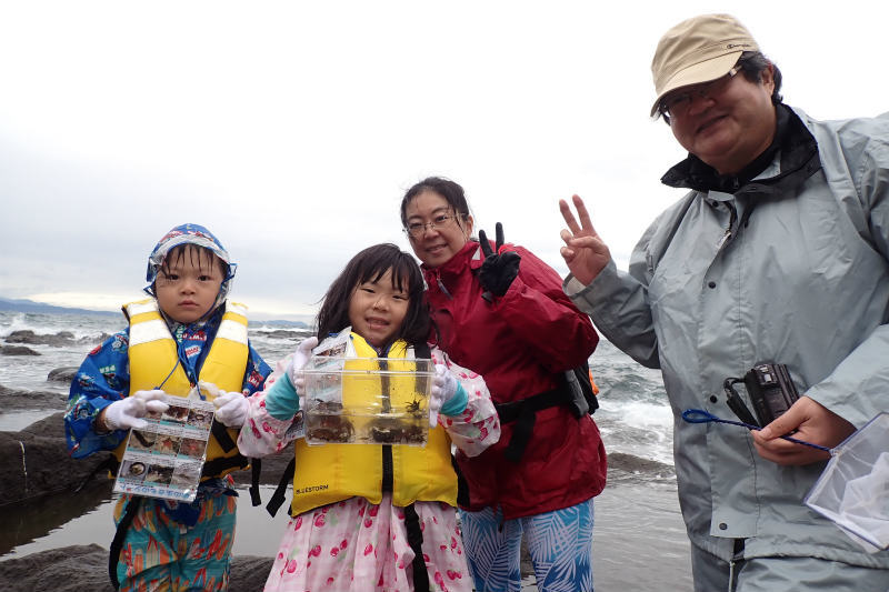 秋になって気温は低くなりましたが、生物は相変わらずです。石をひっくり返してカニやナマコの子供がどっさり!岩肌にはエビがたくさん!この日は潮が高かったのでウメボシイソギンチャクが触手を出していたり…最初はフナムシが嫌で騒いでいた子供達もいろんな生物に出会う中で徐々に海に慣れていったようです。